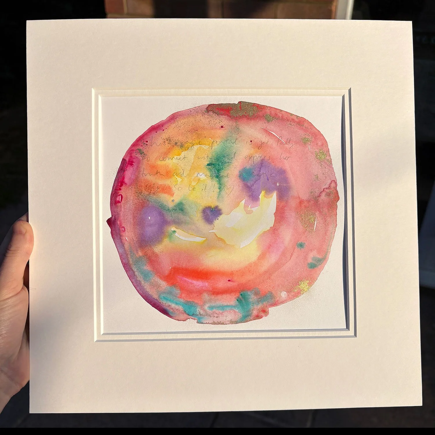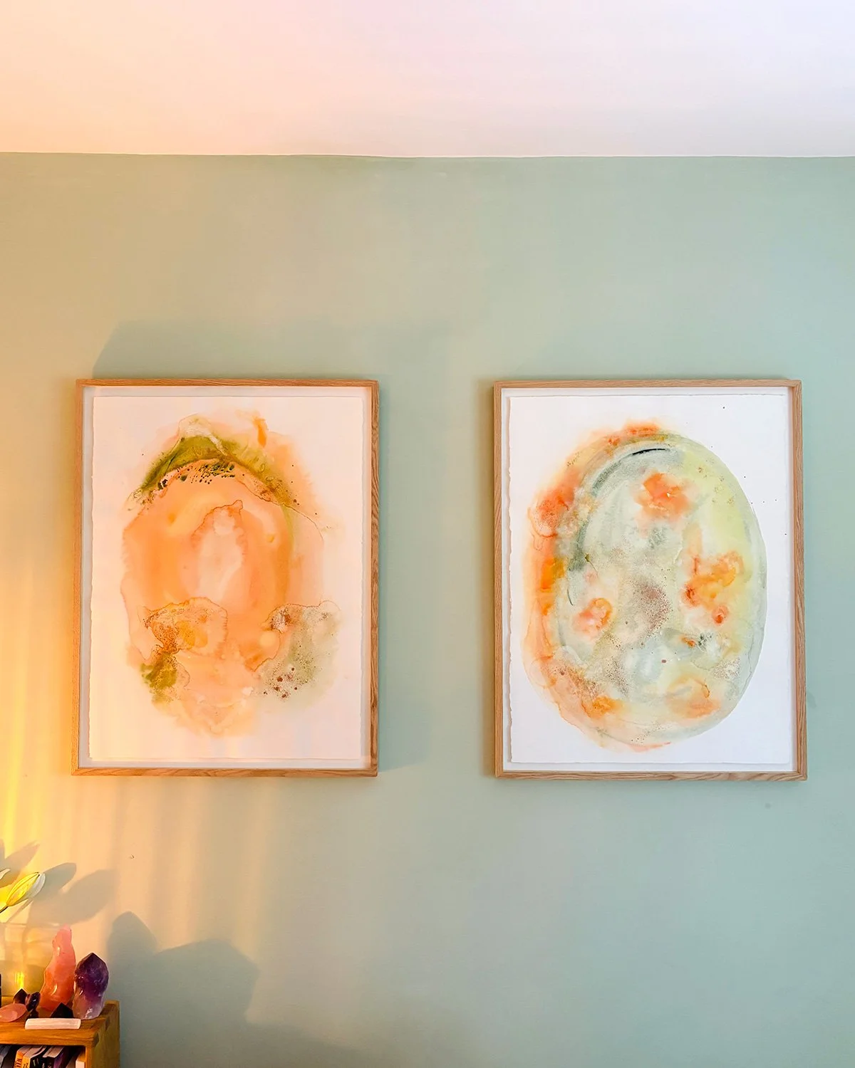Astrologically, I selected a time to create the artwork that fused the positive energy of the two benefic planets (a grand water trine between Venus, Jupiter and Saturn). I visualised this energy infusing the physical watercolour. The water used for the watercolours was energetically charged with 528hz “love frequency”, accompanied by rose petals, lavender and cinnamon, and elevated with selected crystals to boost the intention. The colours green and orange represent the heart and sacral chakras, with a sprinkle of copper pigment for the magical sparkle.